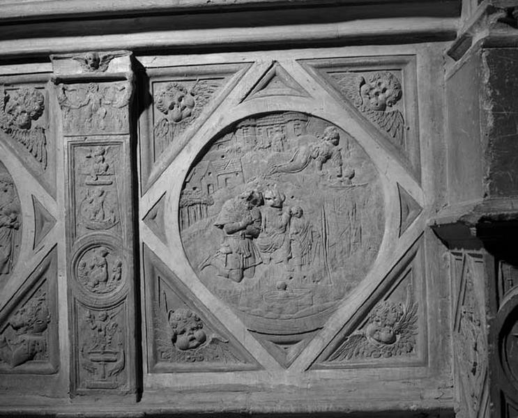 Sixième travée sud, soubassement de la première section, médaillon droit : vue d'ensemble.