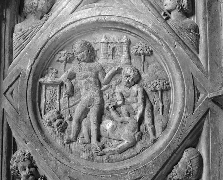 Neuvième travée nord, soubassement de la première section, médaillon droit : vue d'ensemble rapprochée.