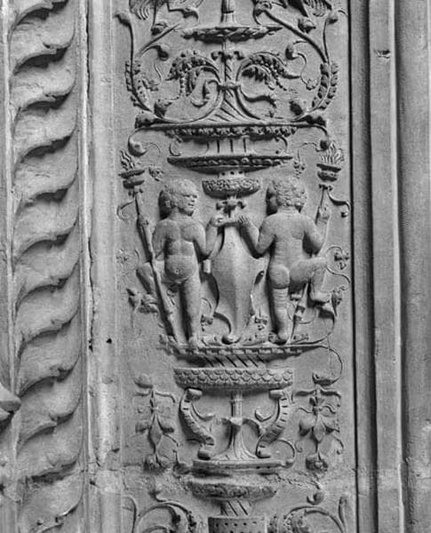 Treizième travée nord, claire-voie de la première section, encadrement gauche : décor de candélabre, amours en pied dansant, portant des torches allumées et tenant un cuir découpé vide.