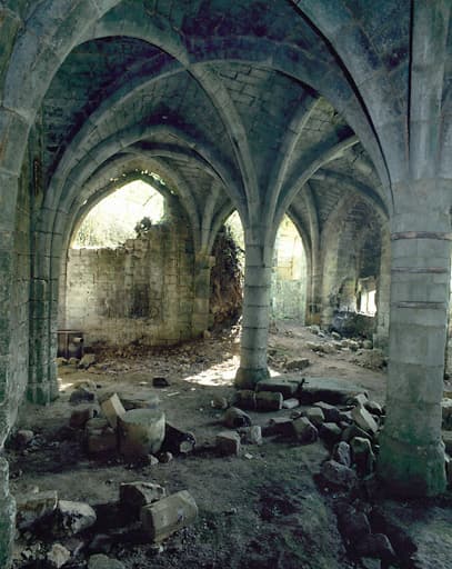Aile sud, vue intérieure de la salle voûtée, prise vers le mur de la seconde salle.
