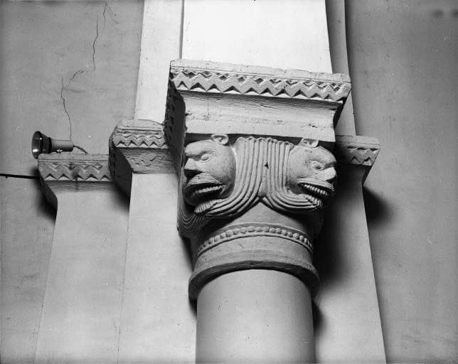 Vue de détail du chapiteau zoomorphe, troisième travée sud-est