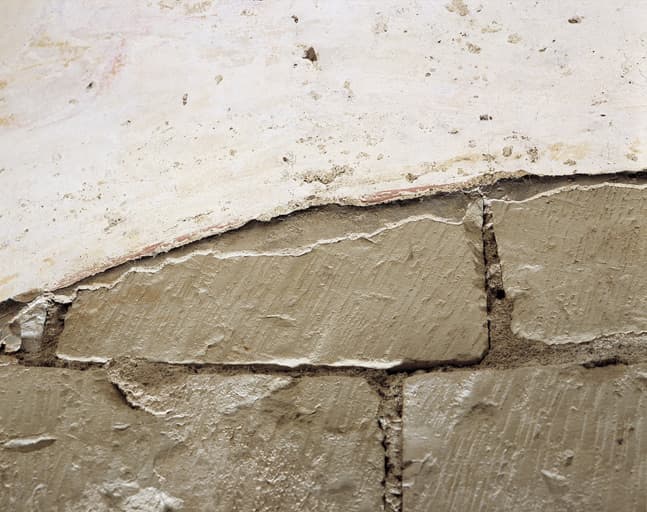 Crypte : Traces d'un enduit fin gris-bleuté posé sur le parement, appartenant primitivement au choeur et recouvert partiellement par un voûtain (abside, à gauche de la colonne axiale)