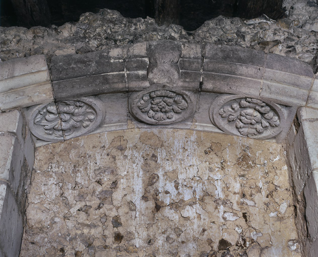 Vue intérieure de la salle basse du clocher. Mur Est. Détail de la baie. Ornementation du linteau. Décor floral.