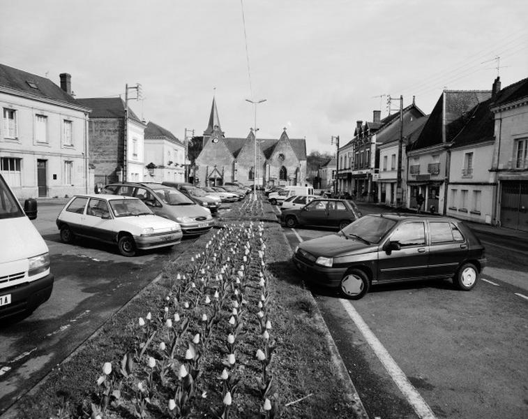 Vue de la place de la République, prise depuis l'axe central avec l'église à l'arrière plan.