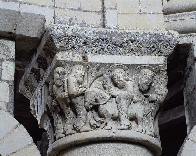 Chapiteau n°5 : L'entrée à Jérusalem. A l'abaque figure l'inscription : 'EXEUNT DE IERLM PUERI HEBREI (IAVEH ?)'.