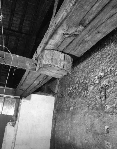 Le poinçon de la première ferme de la charpente sous le faux-entrait en moise.