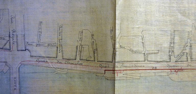 Plan d'ensemble des quais et de la ligne de défense contre les inondations, 11 février 1858, par l'ingénieur ordinaire Sainjon. Détail. (archives nationales, site de Paris, F 14 6642).