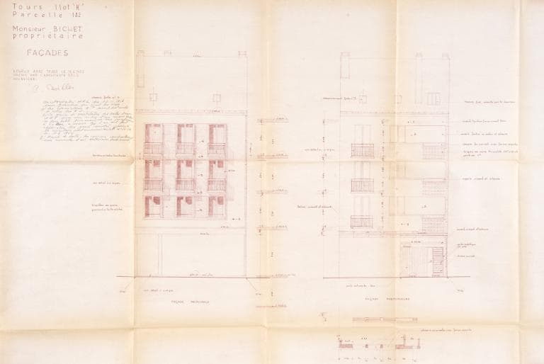Elévations des façades principale et postérieure du 3 rue Marceau, P. Boille arch., 18 juin 1956. (archives municipales de Tours, Permis de construire 1956/n°452).