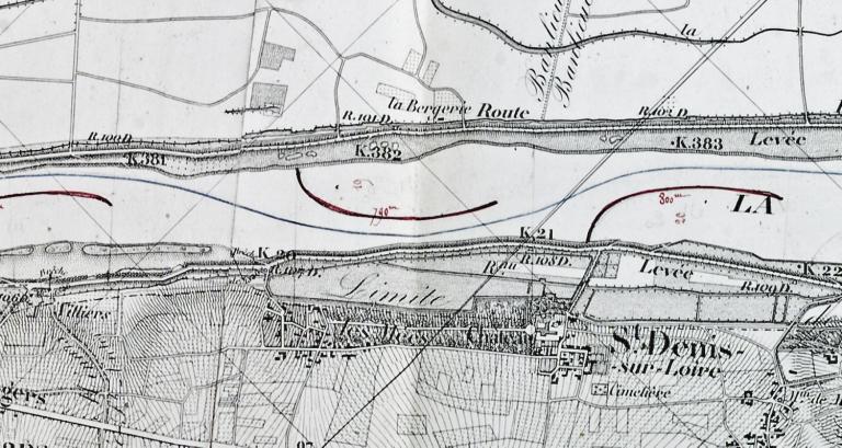 Extrait de la carte de la Loire de Coumes de 1848 complétée par l'ingénieur en chef Collin, 22 mai 1858, détail. (archives départementales du Loiret, Liasse 30936). ; Extrait de la carte de la Loire de Coumes de 1848 complétée par l'ingénieur en chef Collin, 22 mai 1858, détail. (archives départementales du Loiret, Liasse 30936).