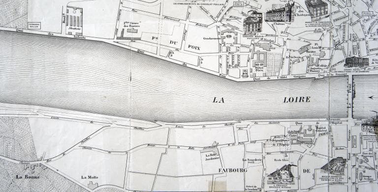 Nouveau plan de Blois monumental, industriel et commercial, 1899. Détail sur la partie située en aval du pont. (bibliothèque Abbé Grégoire, Blois, RLV 505).