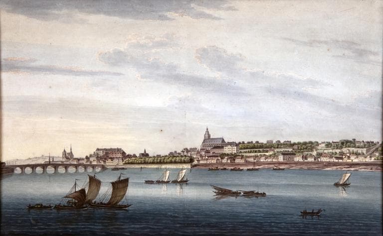 Vue de la ville de Blois et de la Loire, en amont du pont, rive droite, non datée (entre 1730 et 1770). On distingue le Mail planté depuis 1730 et le port Saint-Jean (simple grève). (bibliothèque Abbé Grégoire, Blois, RLZ 306).