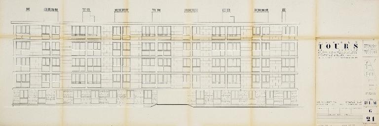 Bâtiment G - plan de la façade sud - 1955. (Archives communales de Tours, section contemporaine, Permis de construire n°55-727).
