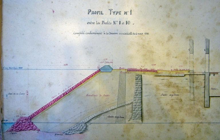 Défense de la ville d'Amboise contre les inondations, achèvement du quai des Violettes, plan de l'ingénieur Descombes, 20 août 1867. Détail sur le tunnel de l'Amasse. (archives départementales d'Indre-et-Loire, S 4987).