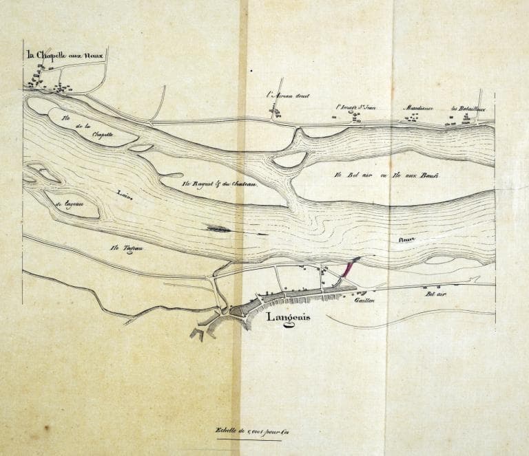 Projet d'un pont à établir sur la passe entre la Loire et la gare du canal de jonction, vers 1826 (projet non réalisé). (archives départementales d'Indre-et-Loire, S 1921).