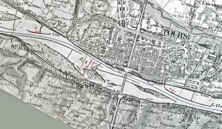 Extrait du cadastre napoléonien de Tours, 1833, partie située en aval du pont de pierre. (archives départementales d'Indre-et-Loire, 3 P/261/5). ; Extrait du cadastre napoléonien de Tours, 1833, partie située en aval du pont de pierre. Mention d'une cale vis à vis du Champ de Mars et d'une levée du Port Neuf. (archives départementales d'Indre-et-Loire, 3 P/261/5). ; Extrait du cadastre napoléonien de Tours, 1833, partie située en aval du pont de pierre. (archives départementales d'Indre-et-Loire, 3 P/261/5).