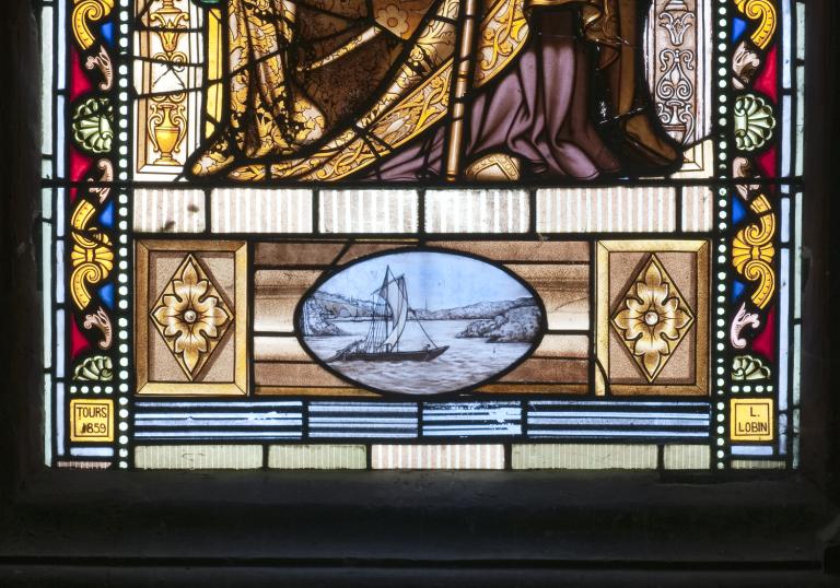 Eglise paroissiale Saint-Saturnin de Blois : vitrail du choeur (côté sud) représentant une gabarre de Loire, 1859, atelier L. Lobin de Tours. Détail.
