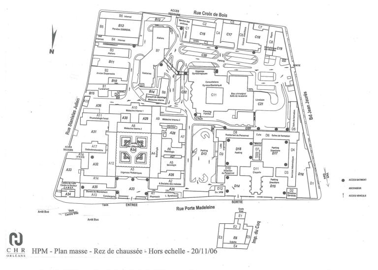 Plan d'ensemble dressé en 2006 (chaque bâtiment est identifié par un code ; CHR d'Orléans).