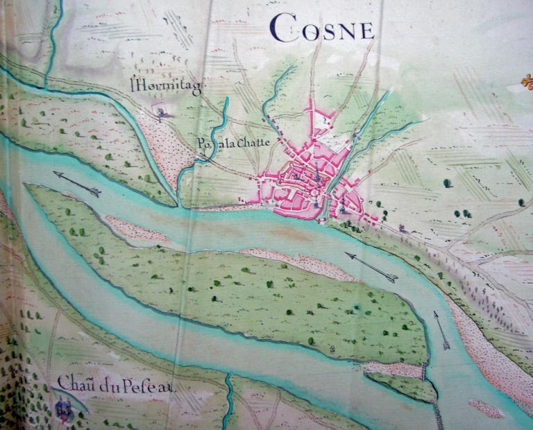 Carte du cours des rivières de Loire et d'Allier depuis Orléans en remontant jusqu'à Decize et Vichy, levée en 1727-1730 sous la conduite du sieur Matthieu. Détail sur Cosne. (école nationale des Ponts-et-Chaussées, Folio 4969).