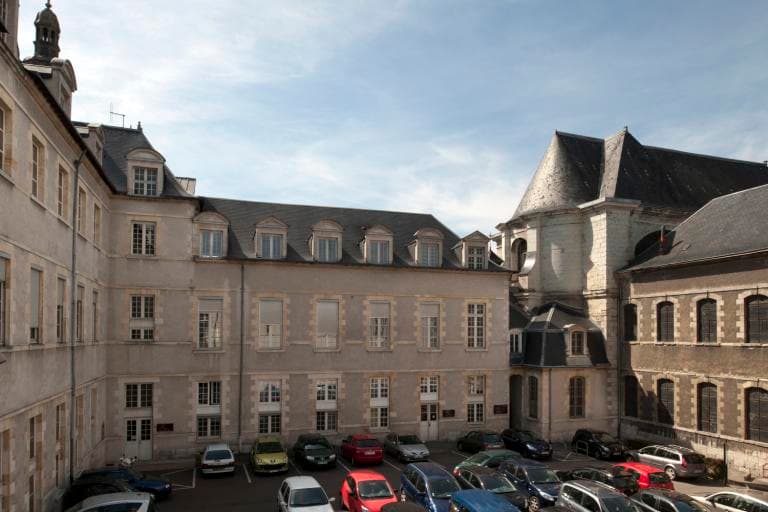 Cour intérieure orientale. Au fond, l'aile médiane (bâtiment D7) ; à droite, la chapelle.