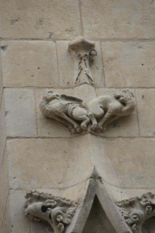 Clocher, vue de détail d'un gâble (2014), décor végétal, d'un hippogriffe et d'un chien.