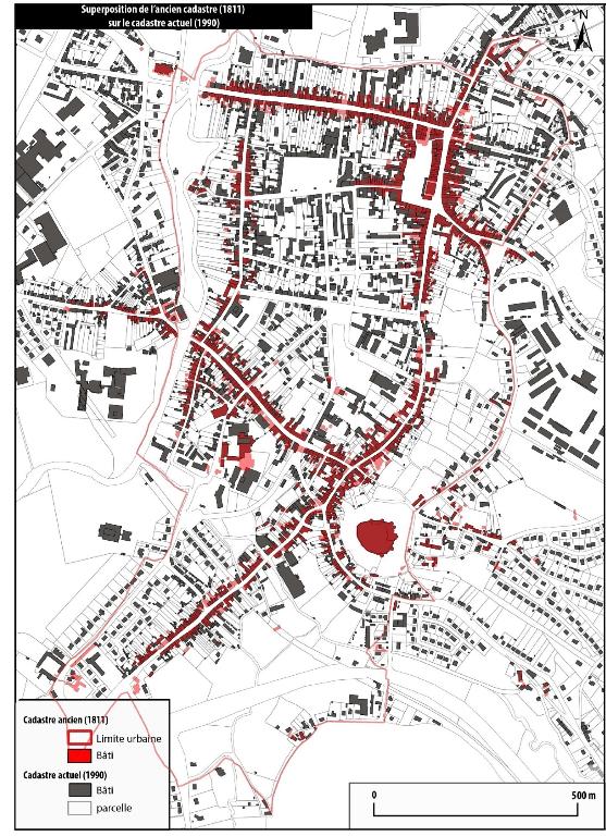 Superposition du cadastre ancien (1811) sur le cadastre actuel (1990).