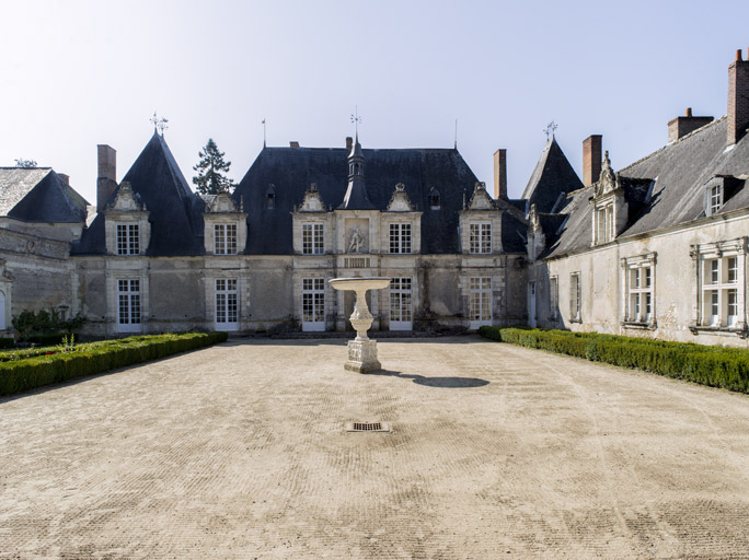 Corps de logis principal précédé de la cour d'honneur avec une vasque. Vue au nord.