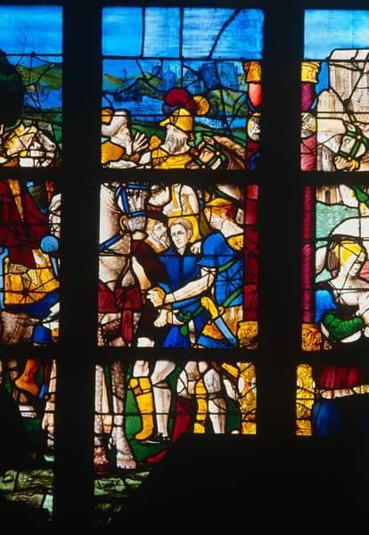 Détail de la baie 2, 2e lancette, registre inférieur : les soldats emmènent saint Portien de force.