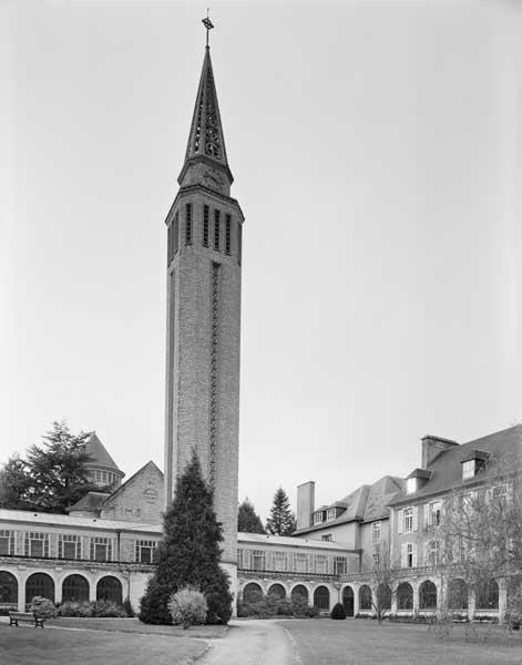 Vue du clocher depuis le sud-est. Entre le clocher et la chapelle du Bon Sauveur, la galerie de circulation permet, outre l'accès à la chapelle, la communication entre deux corps de bâtiments.