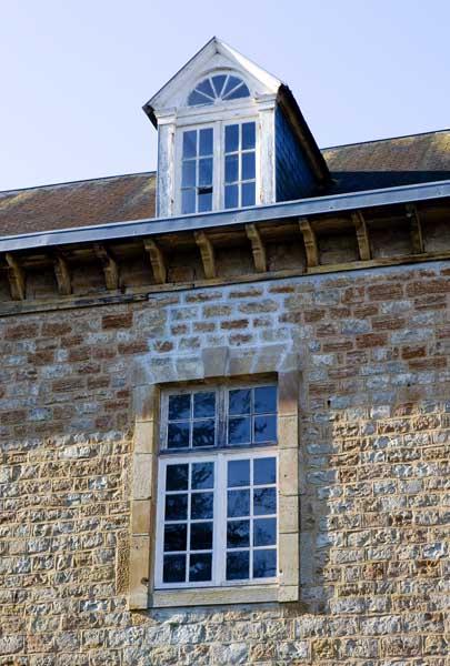 Bâtiment dit 'le Médico' (bâtiment qui accueillait à l'origine des enfants, puis les caves, puis des ateliers, aujourd'hui lieu de stockages divers). Elévation est. Détail : fenêtre du 1er étage et lucarne.