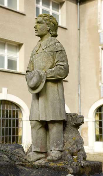 Bâtiment de la Maison de retraite 'Elisabeth de Surville', anciennement bâtiment de la Communauté. Monument du Centenaire (1937), situé dans la cour. Détail d'une figure latérale (jeune garçon).