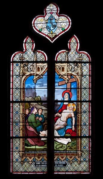 ensemble de 7 verrières (hagiographiques et figurées) : Départ de Julien Mercier pour le Canada, Visite d'Honoré Mercier à Tourouvre, Apparition de la Vierge à sainte Bernadette, Résurrection de la fille de Jaïre, Ange gardien, Déploration, saint Eloi, saint Augustin