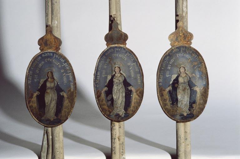 Détail de 3 cierges de procession ornés de l'Immaculée Conception