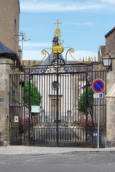 Portail en fer forgé dans l'axe de la chapelle.