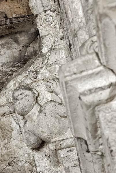 Ancienne chapelle : vue de la pièce médiane ; détail d'un corbeau sculpté.