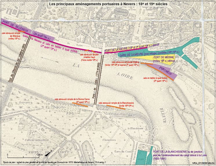 Les principaux aménagements portuaires à Nevers : XVIIIe et XIXe siècle (fond de plan de 1878 par Dumoulin, médiathèque de Nevers).