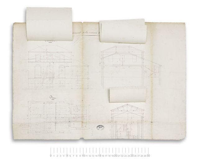 Exhaussement de la maison des archives du canal. Plan, coupe et élévation. Toutes retombes levées.