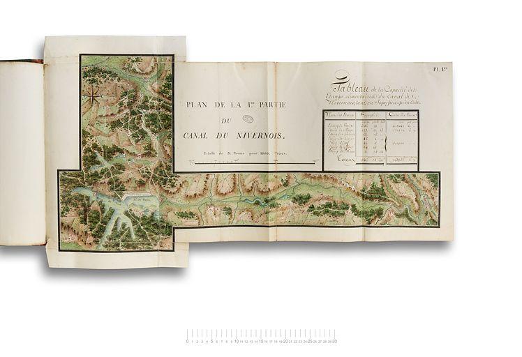 'Plan de la 1ère partie du canal du Nivernois'. Planche Ière de la 'Description du canal du Nivernais tel qu'il a été projeté pour la navigation du Bois, suivie d'un projet économique pour son extension tendant à la faire servir au commerce en général'. Par le Sieur Hageau, Ingénieur en second dudit canal. 1790.