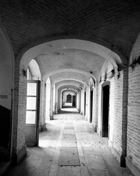 Galerie voûtée située en bordure de la cour des services généraux, au niveau de l'étage de soubassement, section ouest, vue en enfilade.