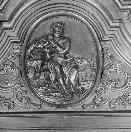 Confessionnal placé entre la 2e et la 3e travée du vaisseau sud de la nef, détail du fronton : relief représentant le Reniement de saint Pierre.