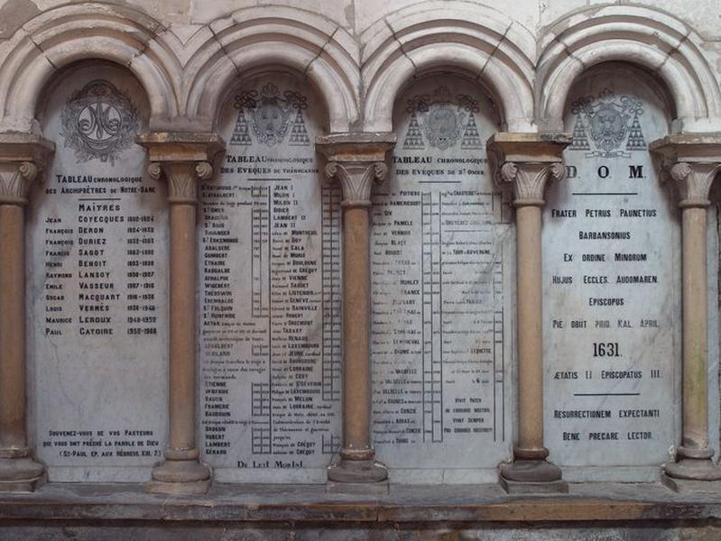 Ensemble : plaques commémoratives des archiprêtres de Notre-Dame, des évêques de Thérouanne, des évêques de Saint-Omer et évêques d'Arras ; mémorial de Pierre Paunet, évêque