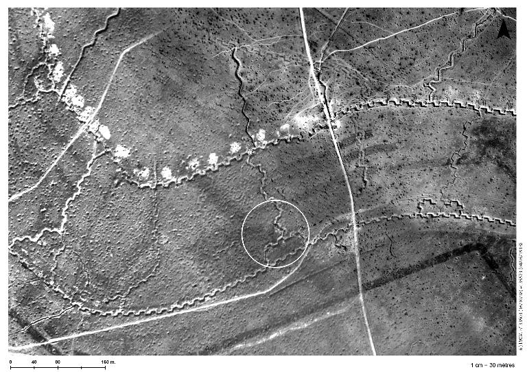 Position de l'édifice sur un assemblage de deux photographies aériennes britanniques réalisées le 16/10/1917 et le 4/05/1917