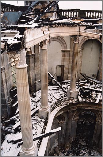 Tribunes côté sud, vue rapprochée de l'est depuis une nacelle, prise après l'incendie du 2 janvier 2003