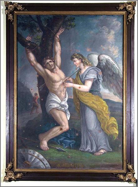 Premier tableau : saint Sébastien secouru par des anges, vue d'ensemble.