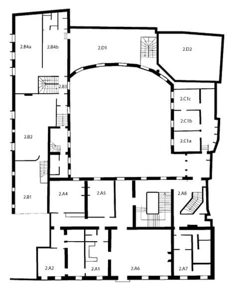 Plan du 2e étage (avec numérotation des pièces), état actuel.