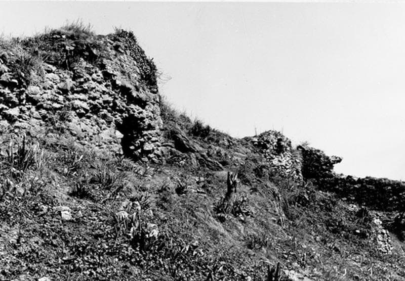 Courtine sud ouest du château : au fond, tourelle ronde, à droite mur ouest d'un avant corps rectangulaire.