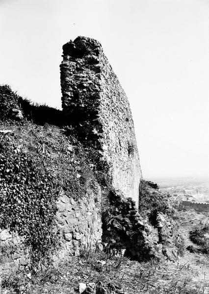 Mur tardif du haut château vu du nord-ouest au sud-est, au premier plan à gauche mur de soutènement récent, à droite et en bas du mur blocage d'un mur de couloir accolé au haut du mur, le parement extérieur étant arraché.
