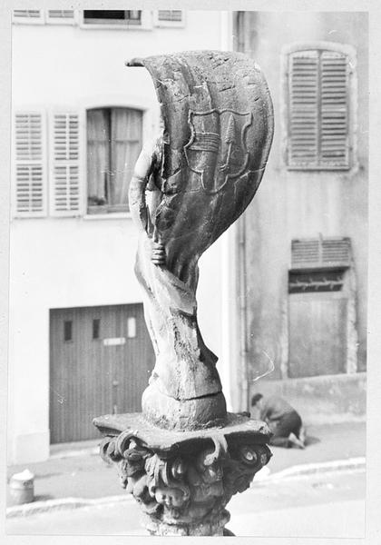 Fontaine des vignerons : statue au sommet de la colonne, vue de dos.