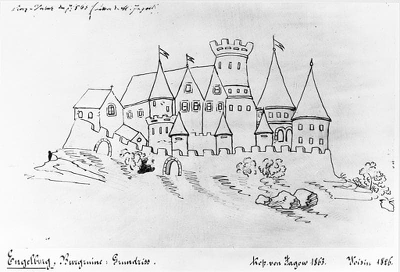 Vue du château reconstituée par Jagow d'après un dessin de Voisin datant de 1826.