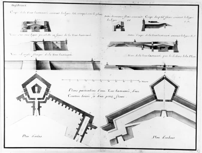 Plans particuliers d'une Tour bastionnée, d'une Courtine brisée et d'un petit flanc.