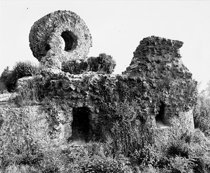 Vue du donjon renversé et du mur d'un petit logis, vus de l'ouest.